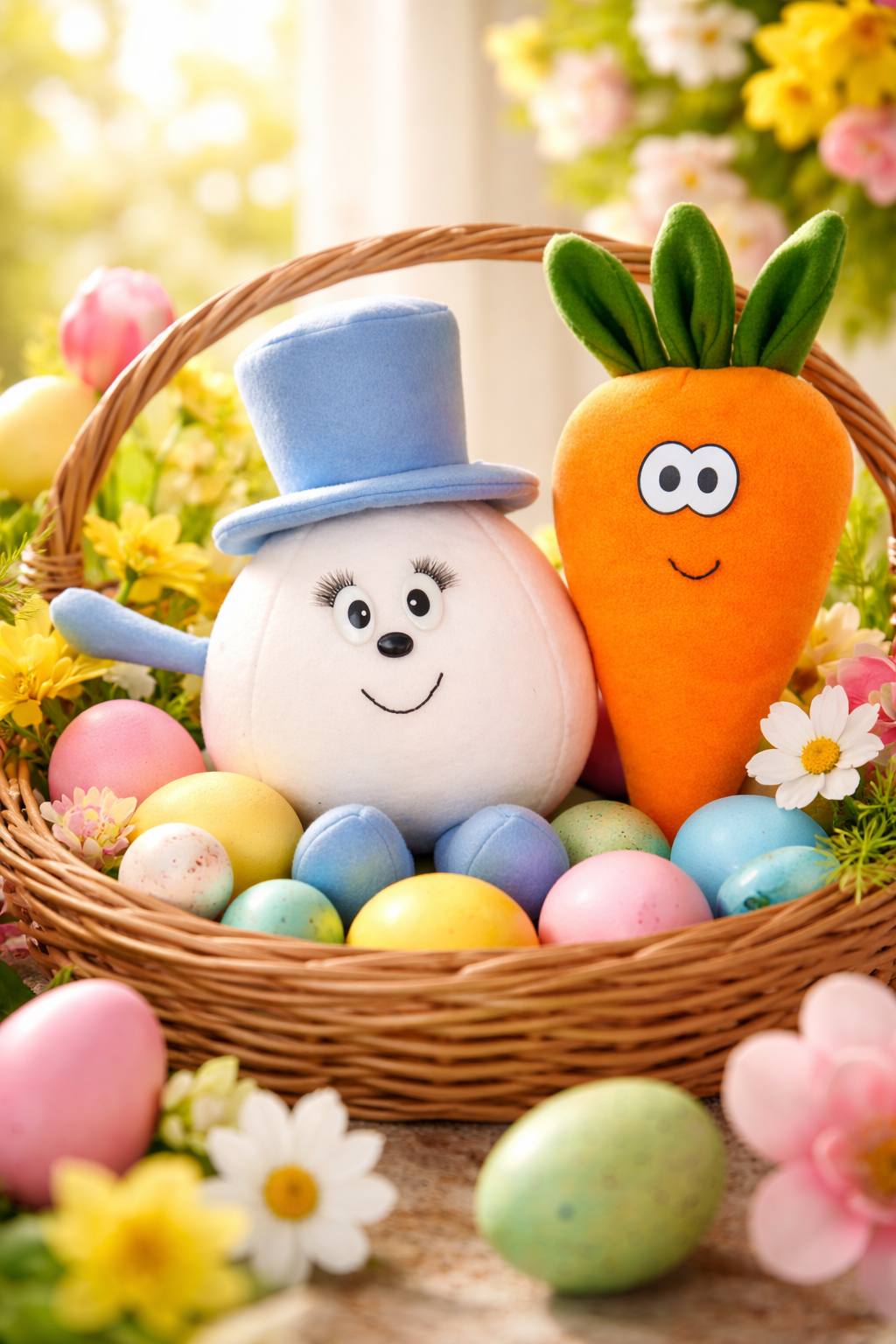 The carrot is tall, vibrant, and full of personality, while the egg comes dressed for the occasion with a charming little top hat. Together they make the perfect Easter-themed plush friends.