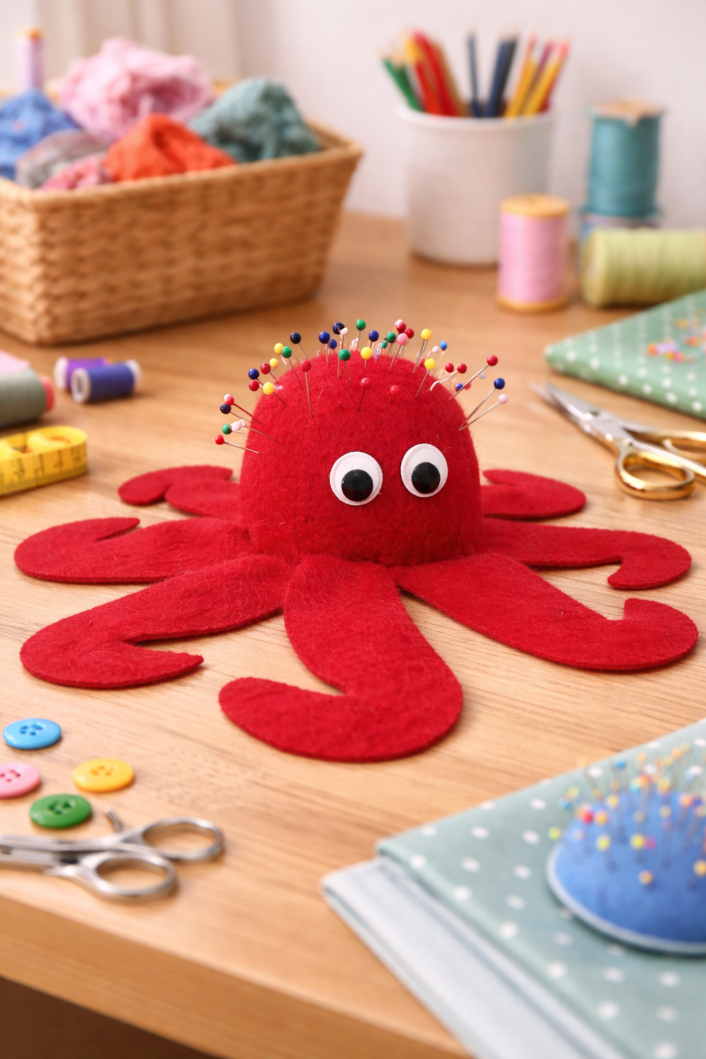 A practical little project with personality. Part pincushion, part desk buddy, all tentacle charm.